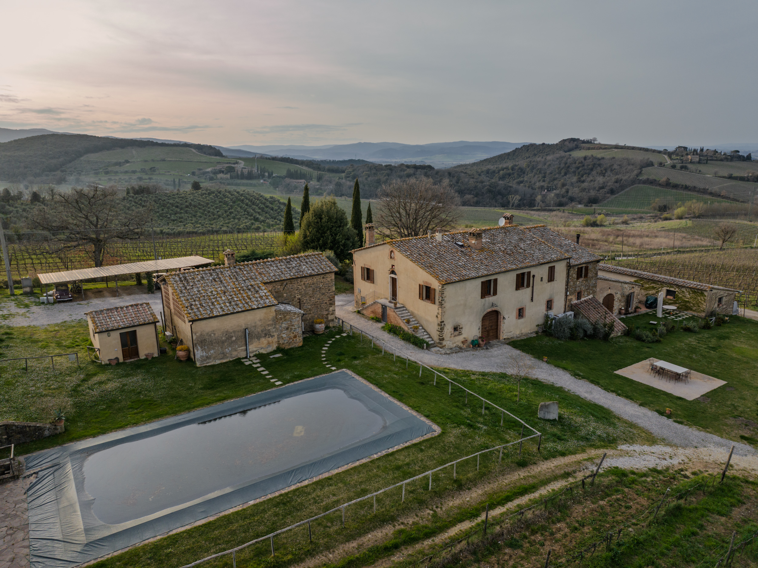The apartment has two bedrooms (one with a double bed and air conditioning, the other with two single beds) and a bathroom with shower. The spacious living room, dining and kitchen area, with a large fireplace and overhead fan, offers spectacular view of the vineyards. All windows have screens and blinds.The apartment is on the upper floor with an exterior staircase. Linens, towels, a small bathroom kit and hair dryer are included.